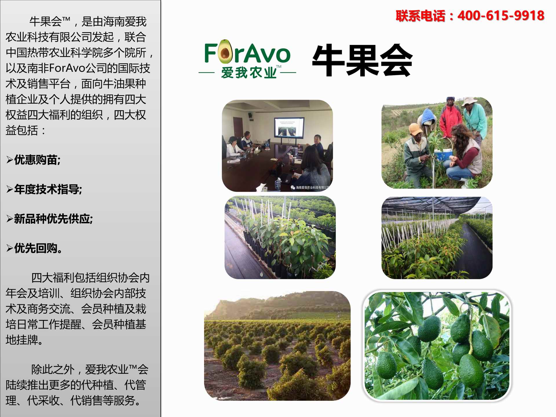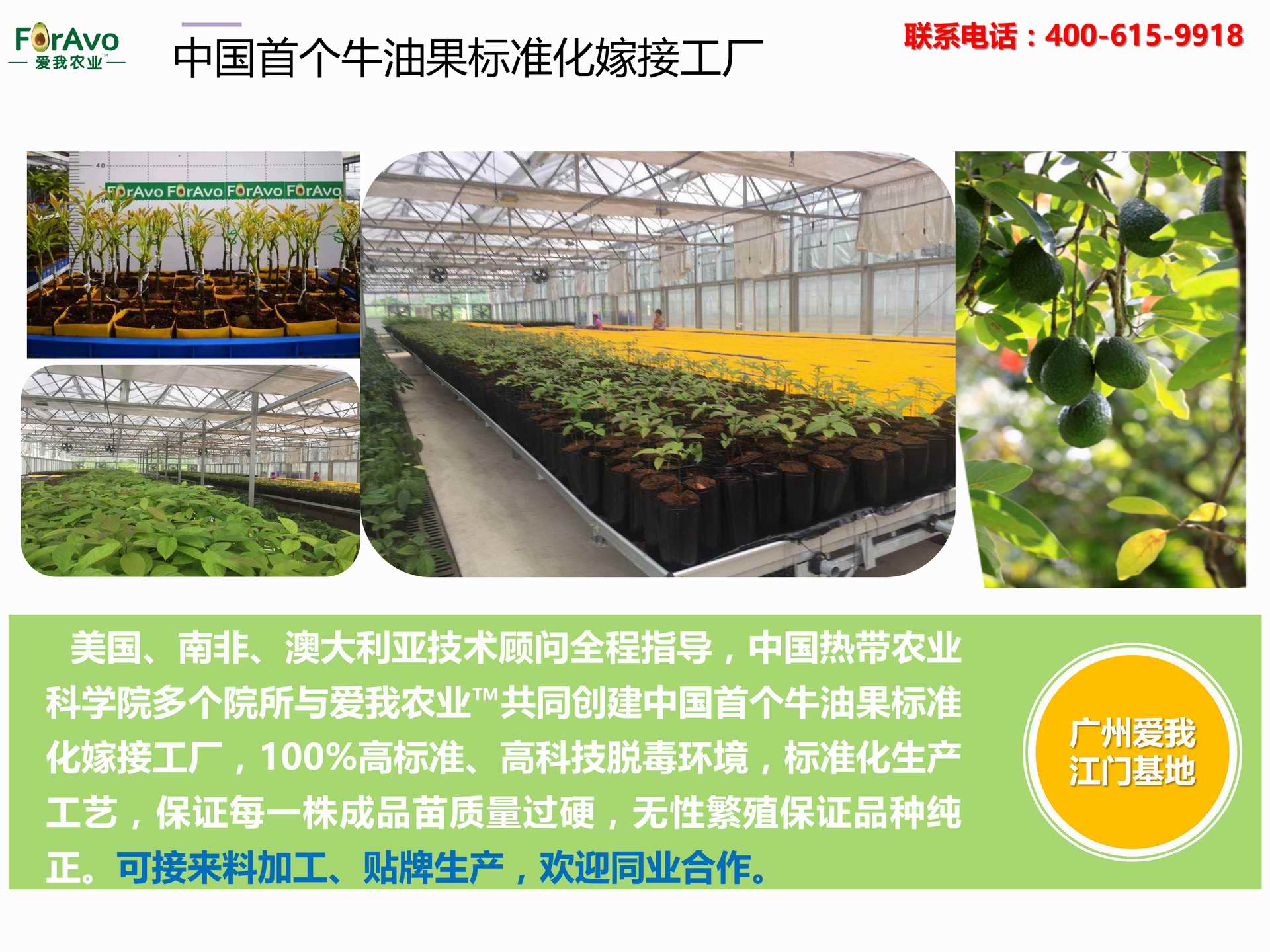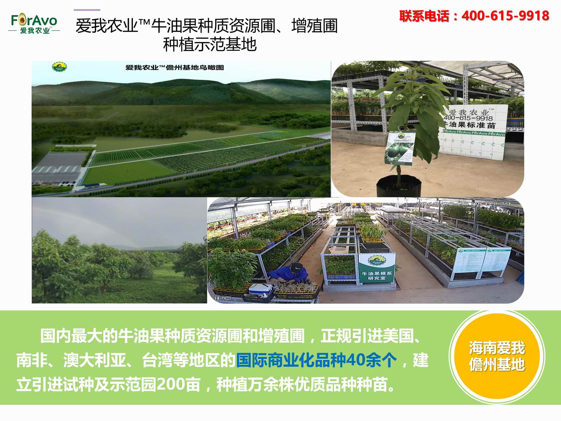 海南愛我農(nóng)業(yè)科技有限公司是一家綜合性的高科技農(nóng)業(yè)發(fā)展企業(yè),旗下愛我農(nóng)業(yè)TM致力于打造中國最大最強的牛油果種植企業(yè)。依托美國、南非、澳大利亞等擁有百年牛油果繁育、種植歷史以及產(chǎn)業(yè)鏈市場的優(yōu)勢,開展牛油果種苗繁育、種植技術,種植加盟、深加工等產(chǎn)業(yè)。結合中國市場,面向廣大苗圃基地、種植農(nóng)場、合作加工等企業(yè),推出的適合規(guī)?;?、標準化的牛油果全產(chǎn)業(yè)鏈服務。 Hainan Foravo Agricultural Technology Co., Ltd. is a comprehensive high-tech agricultural development enterprise , dedicated to building the largest and most powerful avocado plantation enterprise in China. Relying on the advantage of avocado nursery, planting history, and the industrial chain over 100 years in the United States, South Africa, Australia, we are carrying out nursery, planting, proce...